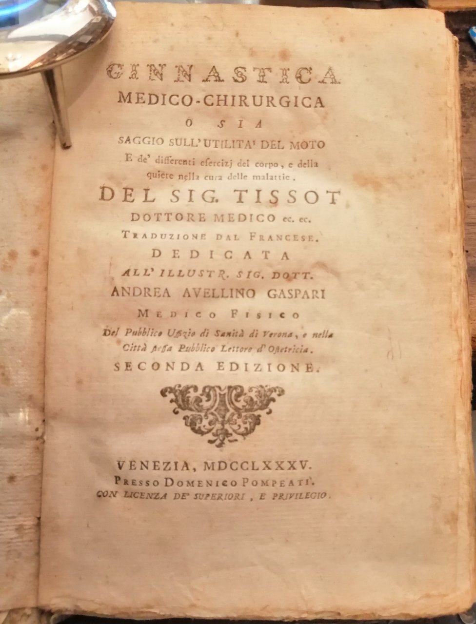 Ginnastica medico-chirurgica o sia saggio sull'utilita del moto e de' differenti esercizj del corpo e della quiete nella cura delle malattie. Del sig. Tissot dottore medico ec.ec. Traduzione dal francese dedicata all'illustr. sig. dott. Andrea Avellino Gaspari medico fisico del Pubblico Uffizio di Sanità di Verona, e nella Città stessa Pubblico Lettore d'Ostetricia. Seconda edizione.