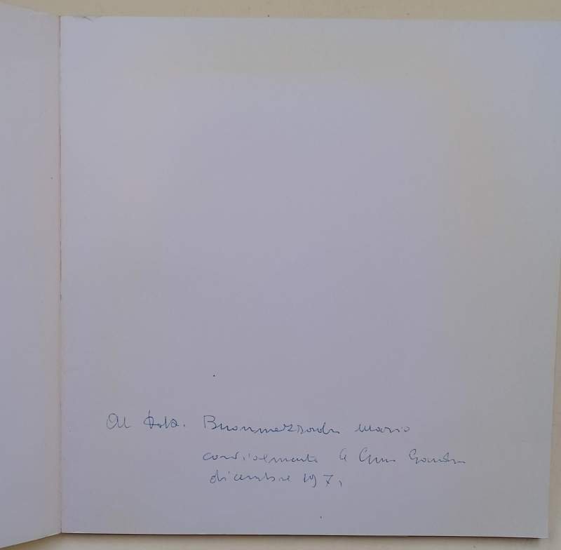 In 8' carre', br. ed. pp. nn., tavv. col, dedica autografa dell'Artista in prima bianca, conservate 2 brochure di mostre dell'A.(foto); lievi ingiallimenti e segni del tempo, buon es. ***Due to bureaucratic reasons, books dated over 70 years old cannot be immediately exported, please contact us before placing the order.***