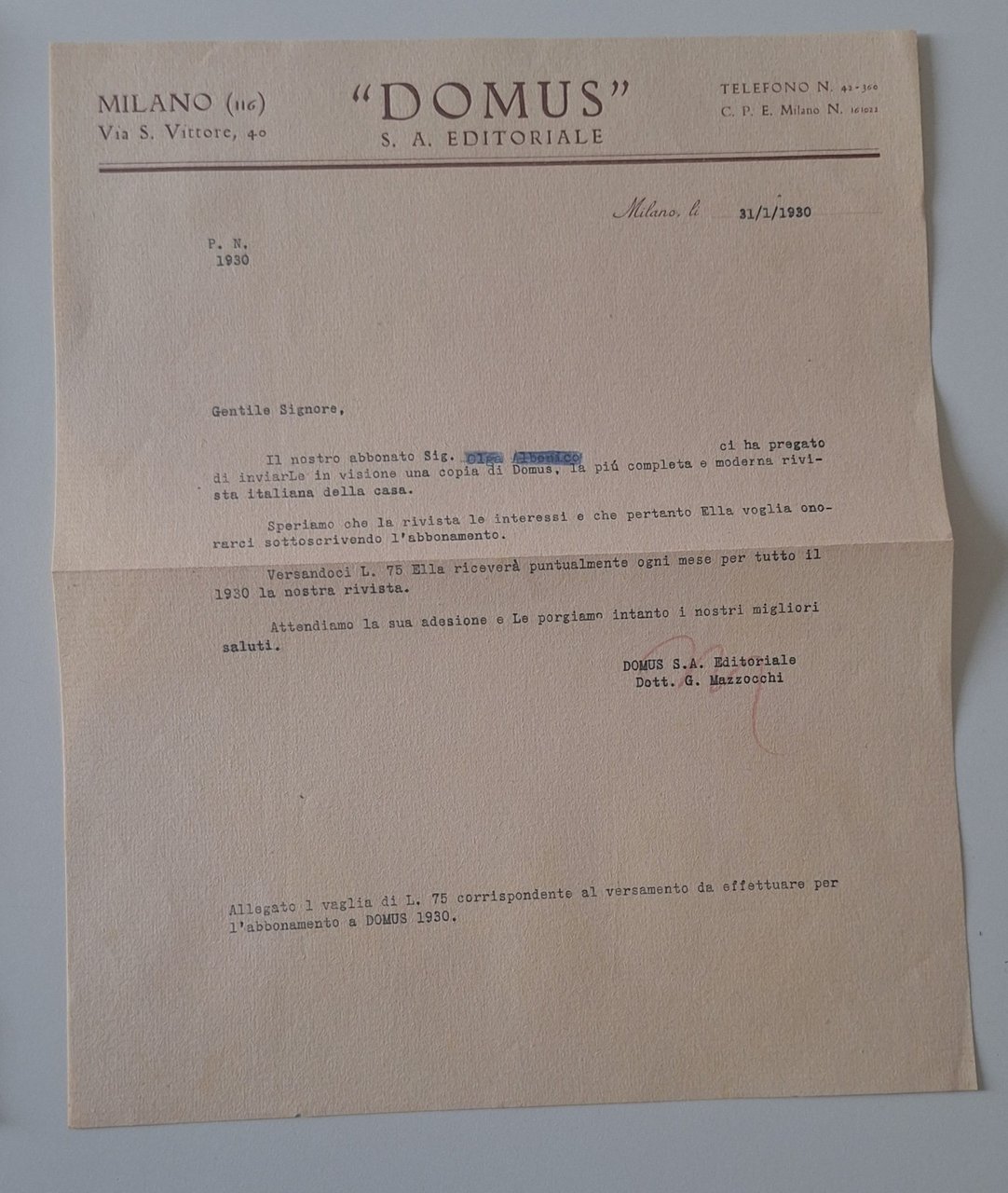 Cm. 38 X 30, incisione in b/n. Allegata lettera su carta intestata domus.Lievi segni e piccoli strappi ai margini.TUTTI I NOSTRI LIBRI SONO VISIBILI PREVIO CONTATTO MAIL, TELEFONO O WHATSAPP NELLA NUOVA SEDE DI MILANO: