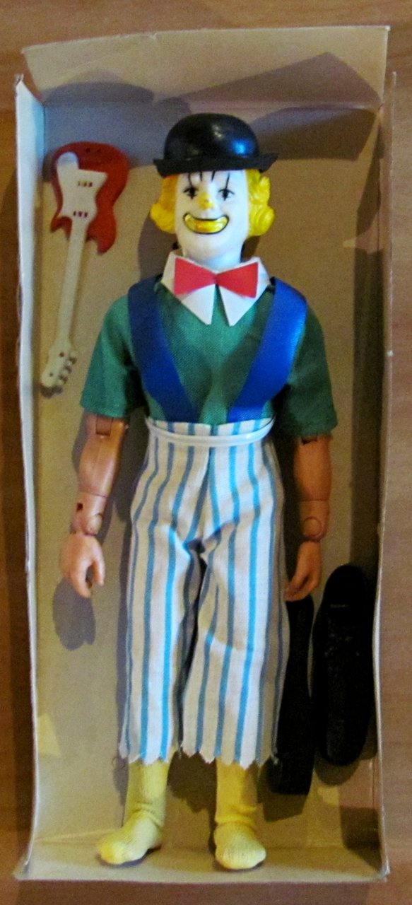 Dondy il Clown. Con scatola originale e accessori (scarpe da Clown, cappello e chitarra). Ceppi Ratti Dolls - s.d. anni 1970. Modellino di Dondy Il Clown con scatola originale, a cui il personaggio è ancora legato. Scatola 10x22x4. Mai Giocato e in Ottimo stato. , Ottimo (Fine)