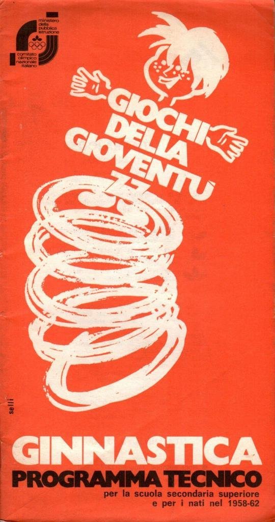 "Giochi della giovent˘. Ginnastica. Programma tecnico per la scuola secondaria superiore e pe ri nati nel 1958-62", nona edizione febbraio 1977, pp. 59, formato 11 x 22.