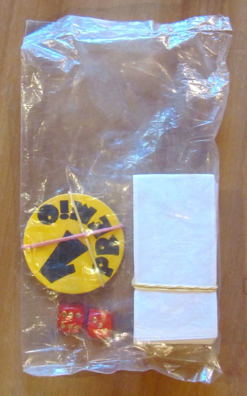 Scatola in cartone originale contenente: 1 tavola con 40 Carte a colori non ancora staccate; 1 Plancia in b/n riproducente le Carte illustrate; 1 Bustina ancora sigillata con i Dischetti Premio, le Banconote e 2 Dadi; Istruzioni all'interno della scatola. 1 Foglietto pubblicitario delle Creazioni Banfi