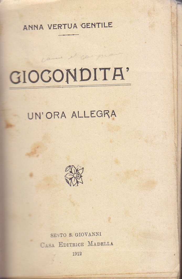 GIOCONDITA' un'ora allegra di Anna Vertua Gentile.Casa Editrice Madella 1912.359 Pagine. Copertina editoriale in tutta tela. Stato di conservazione: discreto - buono (pagine ingiallite, pagine un po’ imbarcate, brutta rilegatura, varie macchioline) img{max-width:100%}