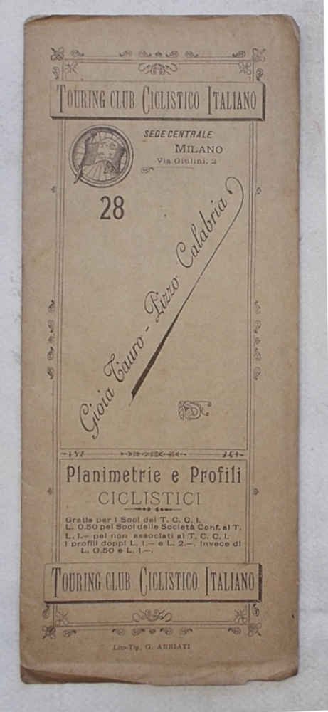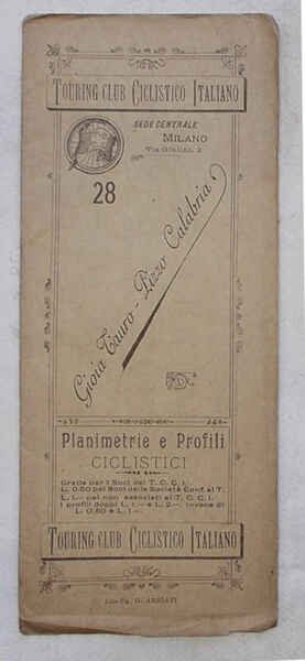 Tavola di 12 facciate di cm. 21,5 x 8,5 (perciò lunga cm. 102 circa). VG. ** Verificato sul terreno nel maggio 1897. Le "Planimetrie e profili ciclistici" del Touring Club Ciclistico Italiano sono una collezione di pubblicazioni che ha qualcosa, anzi è più esatto dire molto! di epico: i 57 itinerari, pubblicati in 51 fascicoli tra il 1896 e il 1901, Luigi Vittorio Bertarelli, il fondatore del T.C.I., se li è fatti tutti in bicicletta, appuntando ogni informazione utile su un taccuino. Ogni itinerario è descritto su una lunga tavola, che si svolge orizzontalmente e che è ripiegata in una copertina con titoli, fregi e piccolo stemma del T.C.C.I. La tavola presenta un profilo altimetrico a tre colori e la cartina dell'area, con il tracciato evidenziato in rosso. Il profilo, oltre alle quote, contiene l'indicazione delle distante, della qualità delle strade (polverose, discrete, buone.), delle tappe e altre notizie utili (sorgenti, "splendido panorama", hotel, ristoranti, servizi postali.).