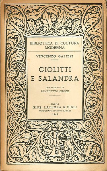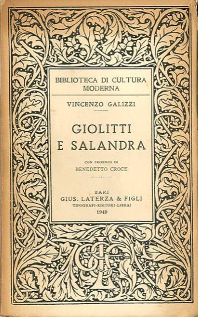 XXIV, 147 p., [1] c. di tav. : ill. ; 20 x 13 cm. Biblioteca di cultura moderna, 458. Con proemio di Benedetto Croce. Indice: Giovanni Giolitti. Proposta d'un libro sulla sua vita politica; Intorno al pensiero politico dell'avversario del Giolitti Antonio Salandra; Commemorazione di Napoleone Battaglia. Brossura editoriale, coperta in cartoncino flessibile, titolo impresso al dorso e al piatto in nero con una cornice con motivi floreali tipici della collana. Ritratto di Vincenzo Galizzi in antiporta su carta patinata lucida, fuori testo. Qualche segno del tempo ai profili della coperta e leggero ingiallimento della carta per il resto esemplare in buone condizioni. Codice libreria 4861.