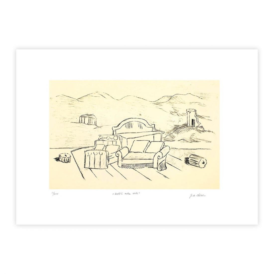 Giorgio De Chirico (1888-1978)Titolo dell'opera: Mobili nella Valle, 1971Incisione a vernice molle mm 490x320 (cm 70x50)Firmata e numerata a matita dall'Artista: III/XXVBibliografia :Giorgio De Chirico Catalogo dell'Opera grafica 1969-1977Edizioni Bora Ref. Pagina 25 figura 12Certificato di Alberto Caprini Stampatore in RomaCornice come da immagini inclusa