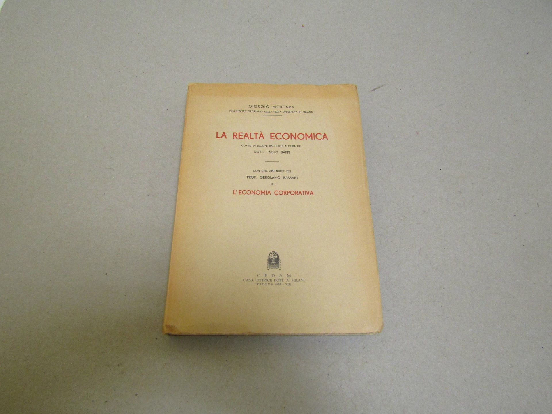 Giorgio Mortara Giorgio Mortara. La realtà economica. Padova, CEDAM 1935 - I italiano, in ottavo pp.336 Corso di lezioni di economia. Pagine e copertina ingiallite. Copertina lievemente usurata.