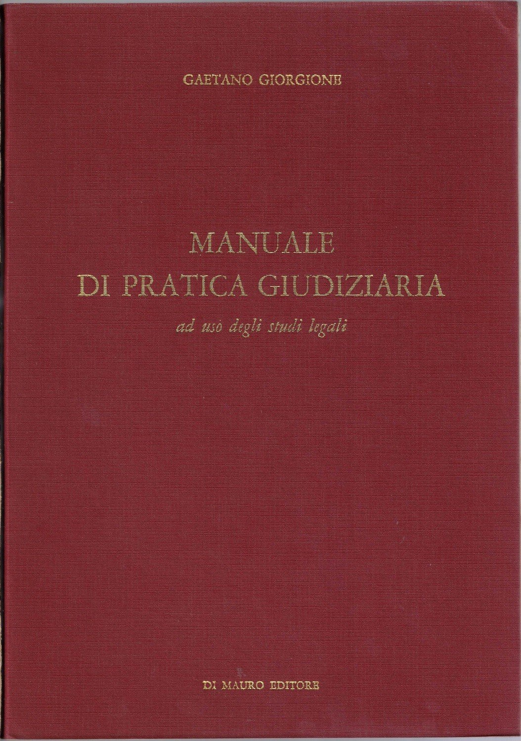 Gaetano Giorgione, Manuale di pratica giudiziaria. Ad uso degli studi legali, prefazione di Alfredo De Marsico, sezione unica di Giovanni De Matteo sul nuovo processo penale, Di Mauro Editore, s.l. (ma stampato a Cava dei Tirreni, presso gli stabilimenti delle Arti Grafiche Emilio Di Mauro) 1979, pp. 235, cm 24, br. ed. Leggere tracce d’uso, ordinari segni del tempo, per il resto esemplare ben conservato.