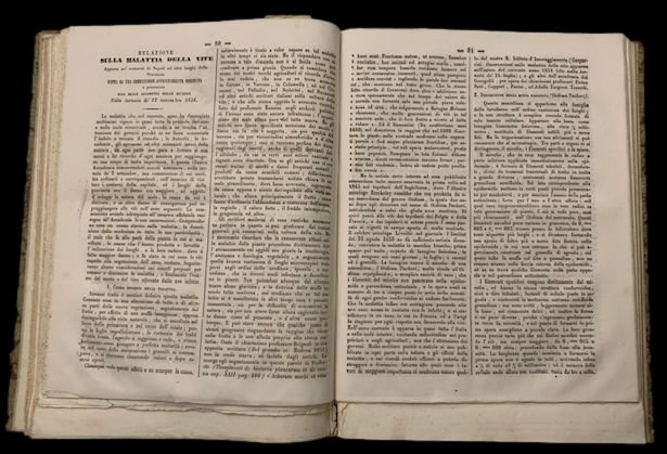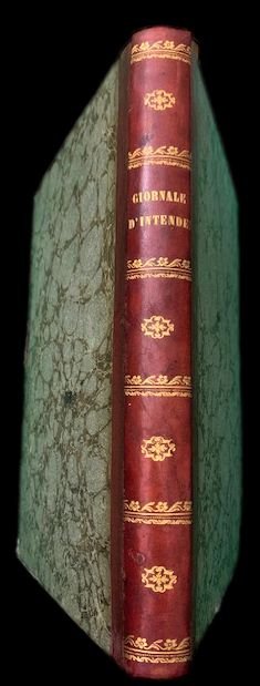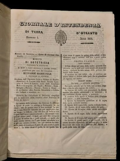 In 4° (29,5x20,7 cm); (2), 154 pp., 140 pp., 182 pp. Manifesto di associazione al Giornale d'Intendenza; Anno 1851, 12 numeri (tutto il pubblicato); Anno 1852, 12 numeri (tutto il pubblicato); Anno 1854 tutto il pubblicato, 182 pp. Legatura coeva in mezza-pelle rossa con titoli e ricchi fregi in oro al dorso. Piatti foderati in carta marmorizzata. Tagli spruzzati. Esemplare in ottime condizioni di conservazione. Prima rarissima edizione del neo-nato Giornale d'Intendenza di terra d'Otranto che pubblicato per la prima volta all'inizio dell'ottocento venne, poi, sospeso verso la fine degli anni quaranta in seguito ai moti rivoluzionari risorgimentali che interessarono il territorio meridionale della penisola, per poi uscire di nuovo con questa nuova apertura. La prima carta contiene la richiesta d'Associazione all'uscita del nuovo Giornale d'Intendenza: Nella tipografia dell'Intendenza di Terra d'Otranto, si aprirà l'Associazione del Giornale medesimo mensilmente e senza ritardo; anticipandosi da' Signori Associati un semestre in carlini sei.. Il giornale contiene notizie di storia locale, scientifici, medici, igienici e articoli su vari temi di interesse legale. Fra gli articoli, ad esempio: Memento di Ostericia contenente la descrizione di tutti i parti naturali e contro natura pubblicato per cura del Cavaliere Giovanni Sannicola; Il Brigadiere riprende il Commando della Divisione Territoriale degli Abruzzi; Privativa accordata al Sig. Luigi Armingoud per la nuova Macchina detta Turbina Idraulico; Disposizioni sanitarie per le provvenienze dal Brasile e dal Littorale Illirico, Ungarico, Dalmato; Manifesto relativo all'Amministrazione de' Bagni Termo-Minerali nell'Ospizio del Pio Monte della Misericordia in Casamicciola d'Ischia; Istruzioni profilattiche sull'Idrofobia; Trattato di Commercio e Navigazione ha questi Reali Domini e quelli S. M. l'Imperatore degli Ottomani; Gli Alunni dello Stabilimento Veterinario debbono esercitare la sola veterinaria non mai la medicina e chirurgia umana; Provincia di Terra d'Otranto agli Abitanti della Città di Lecce, Le inquietudini che nelle ciscostanze di turbini e di tempesto, produceva negli animi de'Leccesi, il pensiero di un pericolo prossimo qual'era quello della possibile accensione della Polveriera di questo Castello che poteva esser prodotta dalla caduta di qualche fulmine ; Colletta a vantaggio de' danneggiati dal Terremoto in Basilicata; Intorno all'esattezza del servizio della Vaccinazione; Manifestazione dell'Intendente della Provincia ai suoi Amministrati intorno ad alcune grazie Sovrane pervenutegli nella ricorrenza del 4 ottobre 1851; Infermità sviluppata nel Comune di Filadelfia in Calabria; Si raccomanda D. Giuseppe Blandamura Chirurgo dentista; Il Catalogo de' Libri Della Società Economica della Provincia di terra d'Otranto; Ordini Cavallereschi, Tutti i beni appartenenti all'Ordine di malta, sono riuniti diffinitivamente al Demanio Pubblico, meno le 8 comende concesse all'Ordine col Real Decreto del 7 Dicembre 1839; Relazione sulla malattia delle uve; Decreti Reali, Reale Indulgenze per la Nascita del Principe D. Pasquale Conte di Bari; Memoria sull'arte di potar l'Olivo; Su la origine e la storia delle Società Segrete; Programma per la Gala del 30 maggio 1854 faustissimo giorno onomastico di S. M. Ferdinando II; e numerosissimi altri articoli di interesse pugliese con note e statistiche non solo dei grandi centri urbani ma anche dei piccoli comuni e paesi. Importantissima fonte di storia locale della Puglia. In ottime condizioni di conservazione.
