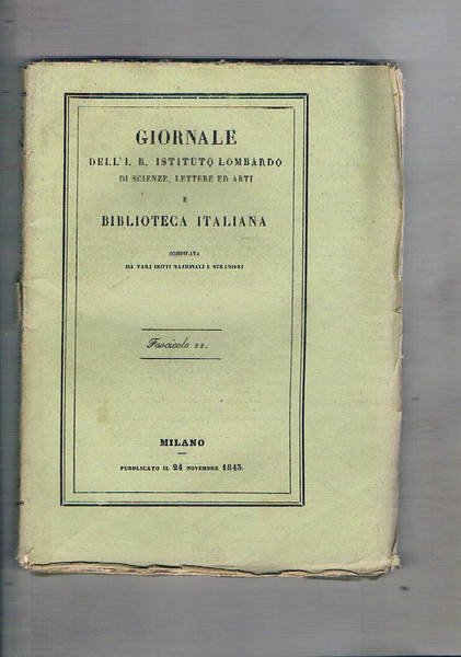 Giornale dell'I. R. Istituto lombardo di scienze, lettere ed arti e biblioteca italiana, composta da vari dotti nazionali e stranieri. Tomo VIII° fasc. 22-24. Il duello e il sacrificio della vita; tromba marina sul lago di Garda; memoria seconda sui minerali della svizzera italiana; ecc.