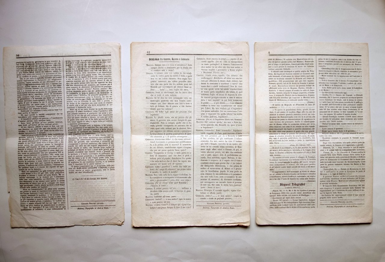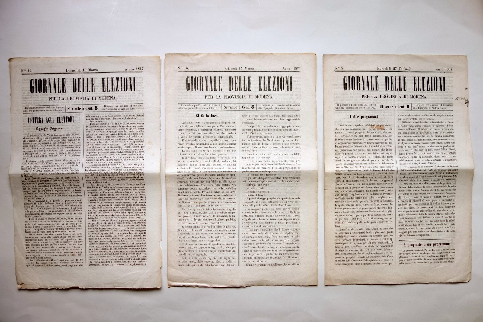 Tre numeri di giornale, Giornale delle Elezioni" per la provincia di Modena Numeri 2, 12, 16 27 febbraio, 10 marzo, 14 marzo 1867 (tre numeri di giornale) Tip. di Andrea Rossi, Modena 1867; cm 37,5x24; pp. 4 non num. (due numeri); foglio fronte/retro (un numero). Tre numeri completi. Condizioni di conservazione Esemplari tutti e tre in buono stato con leggere tracce d'uso, normali pieghe di conservazione, pochissimi marginali strappetti e mancanze. Qualche minima lieve brunitura. Per maggiori dettagli vedi foto. Tre numeri completi di non comune quotidiano modenese di taglio conservatore. SC03.D17049 N BIS "