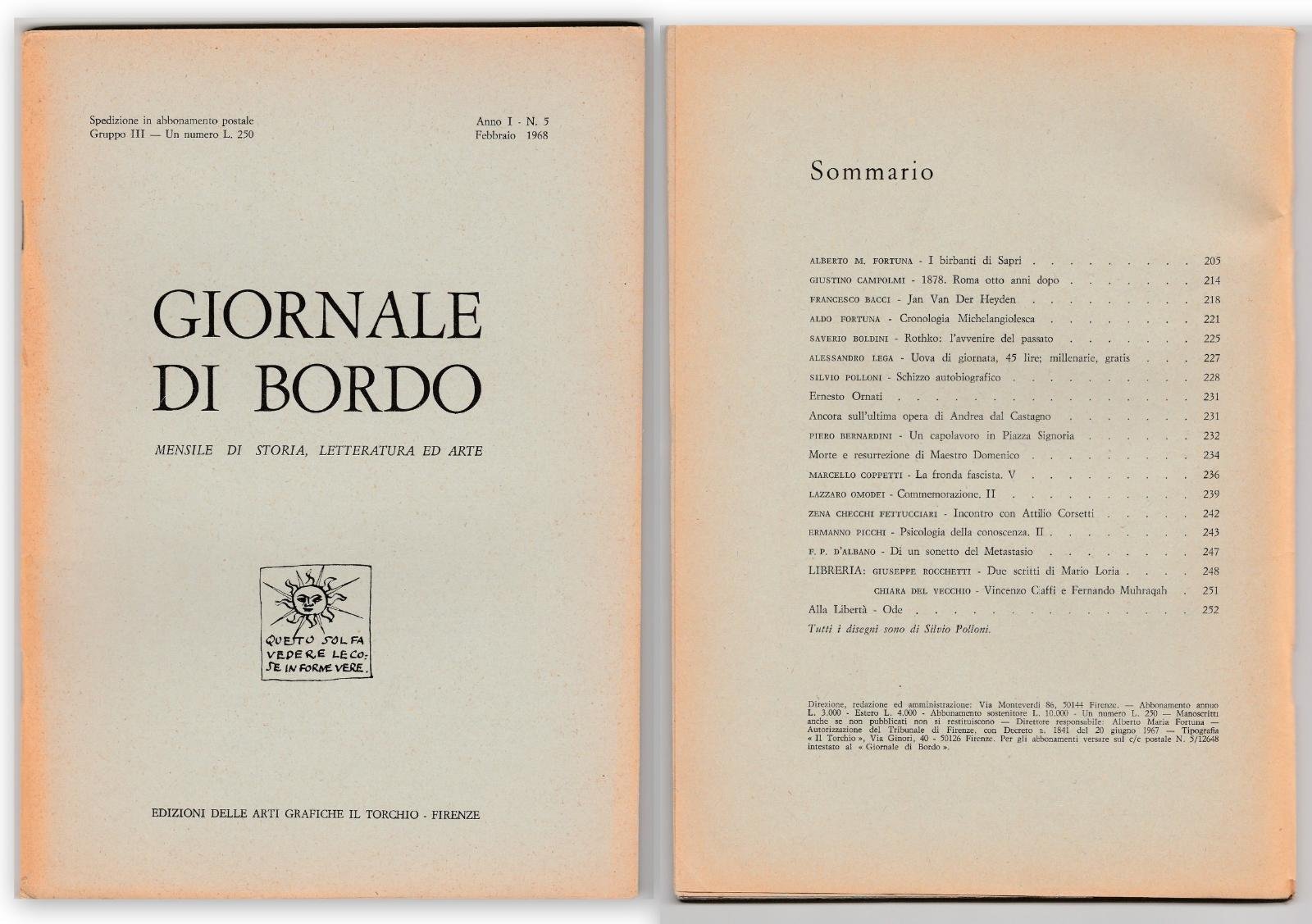 GIORNALE DI BORDO MENSILE DI STORIA LETTERATURA ARTE ANNO N.5 1968 L 4506 COPERTINA MORBIDA EDITORIALE INTERNO IN BUONO STATO, UNA PICCOLA PIEGA ALL'ANGOLO INFERIORE ALLE ULTIME PAGINE DA PAG. 205 A PAG. 252 CM. 24 X 17