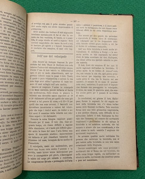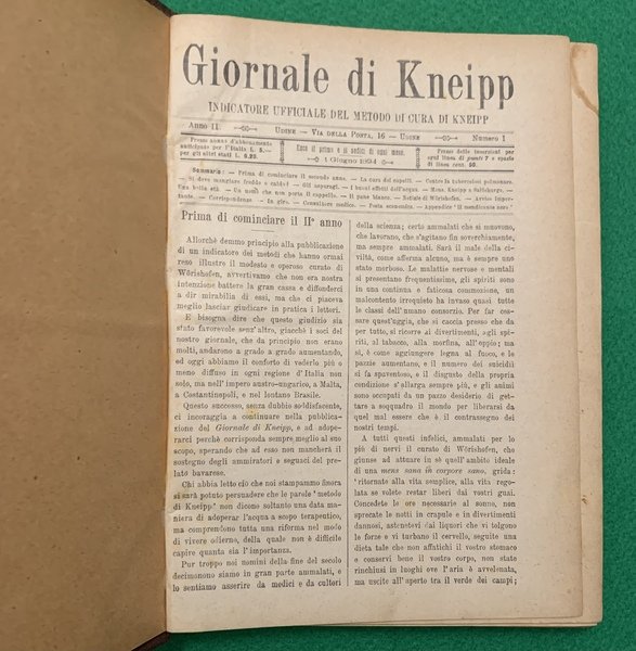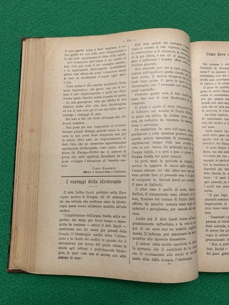 23,5x16,5 cm; 380 pp. Legatura coeva in mezza tela con titolo impresso in oro al dorso (qualche macchia di sporco ai piatti) e sempre al dorso , in oro il nome dell'antico proprietario. Annata completa di questo rarissimo giornale dedicato all'idroterapia che usciva ogni 15 giorni. Il giornale iniziò ad uscire nel 1894. L'annata qui rilegata presenta tutti e 24 i numeri che compongono l'annata ognuno con un suo frontespizio e con le quattro pagine iniziali con la legenda degli articoli contenuti. L'abate e presbitero tedesco Sebastian Kneipp (Ottobeuren, 17 maggio 1821 Bad Woerishofen, 17 giugno 1897) fu colui che riscoprì la celebre pratica dell'idroterapia. L'idroterapia e' un termine che indica sistemi di cura basati sull'acqua, anche se il successo della terapia non e' necessariamente dovuto all'acqua in se', ma ai risultati ottenibili mediante l'applicazione sul corpo umano di vari stimoli. le cliniche che utilizzavano l'idroterapia in Italia sul finire del XIX° secolo erano prettamente localizzate in trentino e in Friuli. I numeri di questa rivista presentano articoli completamente dedicati all'idroterapia ed alla sua applicazione. PRIMA EDIZIONE ASSAI RARA ED IN OTTIME CONDIZIONI DI CONSERVAZIONE.