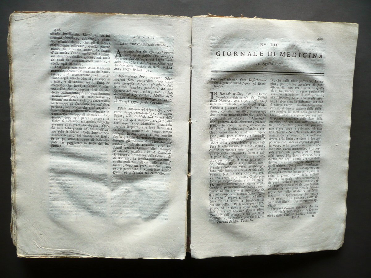 52 numeri di rivista (annata completa), Giornale di Medicina Tomo nono 52 numeri completi corrispondenti all'annata completa 1770 - 1771 Presso Benedetto Milocco, Venezia 1771; cm 25x18; pp. [2]; 424; frontespizio con bella ill. incisa in b/n. Legatura d'epoca in tutto cartonato con titolo annotato a mano entro etichetta applicata al dorso; piatti in carta marmorizzata. 52 numeri completi inseriti entro un unico volume, corrispondenti all'annata completa 1770-71. Condizioni di conservazione Esemplare ben conservato con tracce d'uso, coperta con alcune piccole lievi abrasioni e qualche strappetto, margini dei piatti con piccole / circoscritte mancanze al rivestimento marmorizzato; dorso leggermente ingiallito. Interni buoni con alcune minime bruniture; margine est. di pagina 242 con alcune piccole leggere macchiette che non interessano il testo; contropiatto ant. con vecchia annotazione a matita. 52 numeri completi inseriti entro un unico volume, corrispondenti all'annata completa 1770-71. SETT139.L13473 N