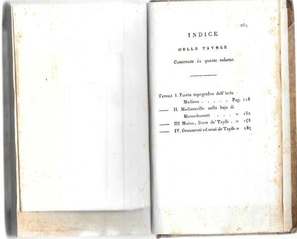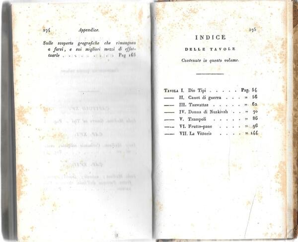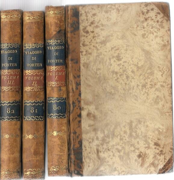 in 8° piccolo (cm 16,5x10), pp. xiii, 247, 1 b.; 275, 1 b.; 267, 1 b.; leg. coeva m/pelle con angoli, tit. in oro su tass. al ds. e fregi, tagli spruzz. Collana: Raccolta de' viaggi più interessanti eseguiti nelle varie parti del mondo tanto per terra quanto per mare dopo quelli del celebre Cook, e non pubblicati fin ora in lingua italiana. Che contiene la descrizione delle isole del Capo-Verde, delle coste del Brasile, della Patagonia, del Perù, del Chili e delle isole Gallapagos; non che una relazione del gruppo delle isole Washington, delle maniere, costumi e foggie di quegli abitanti ec. ec. Prima traduzione dall'originale inglese di F. Contarini, con 11 tavv. in rame acquerellate, ritratto dell'A. all'antip. del 1° vol., e 1 grande c. geogr. delle isole Washington ripiegata in fine del 2° vol. Lievi fior. Molto raro. 557/34