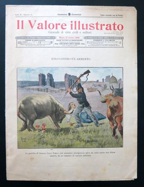 Giornale di virtù civili e militari. Solo contro un armento. La guardia di finanza Luigi Tarsia con esemplare abnegazione salva da certa morte una donna assalita da un armento di vaccine infuriate.