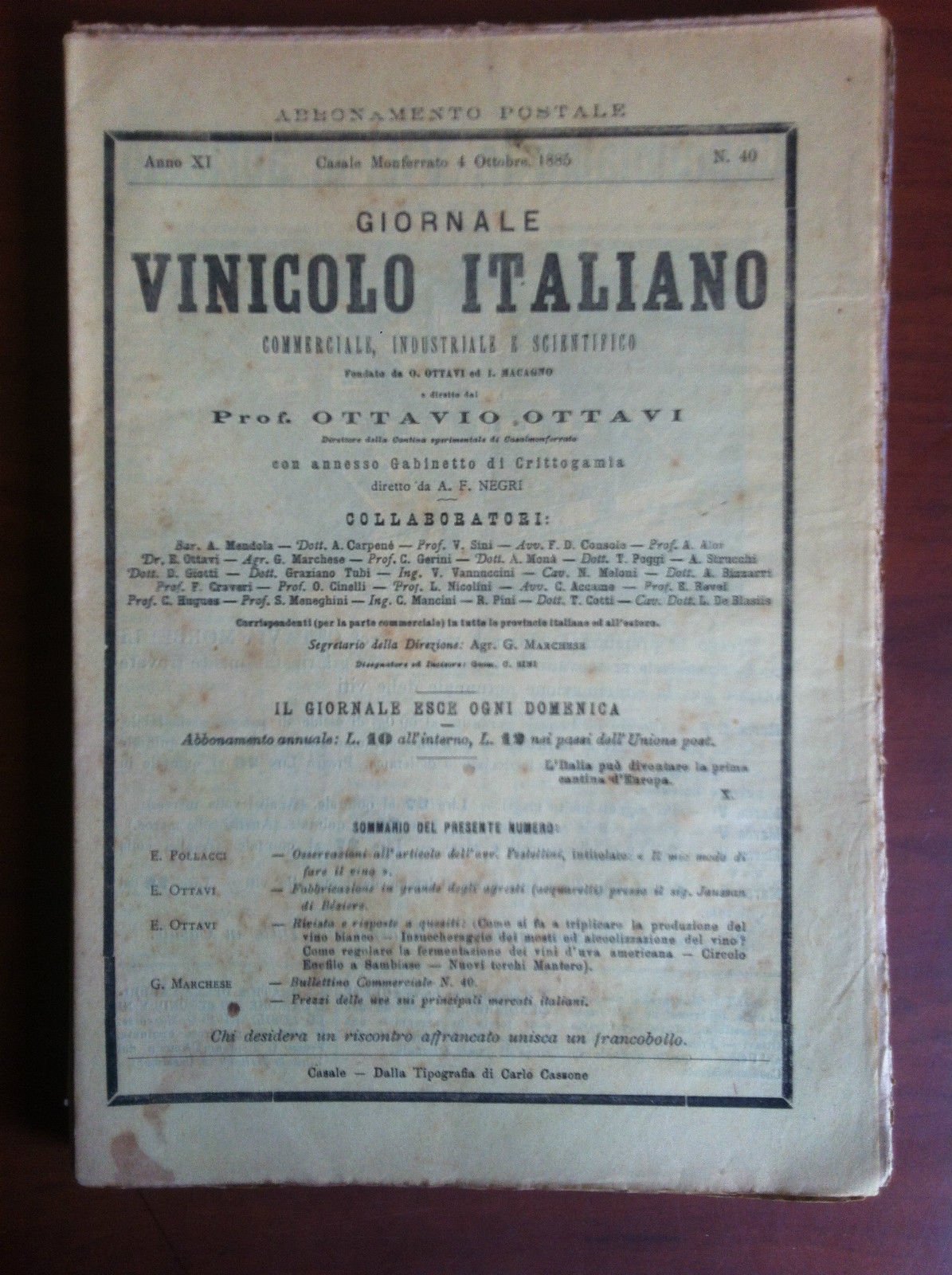Giornale Vinicolo Italiano Anno XI n^40 Casale M.to 4 Ottombre 1885 - E14721
