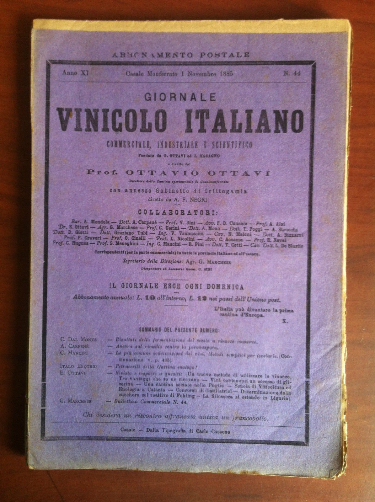 Giornale Vinicolo Italiano Anno XI n^44 Casale M.to 1 Novembre 1885 - E14725
