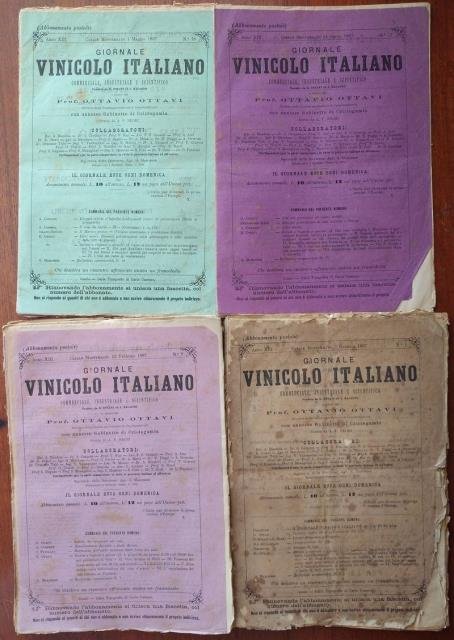 Annata completa dal 2 Gennaio 1887 al 25 Dicembre 1887. In 8vo grande, fascicoli editoriali in carta, copertine posteriori ill. con pubblicità di macchinari, prodotti e aziende del settore vinicolo enologico. Usuale ingiallimento e patina del tempo con alcuni marginali strappetti (più deteriorati il primo e l'ultimo fascicolo) ma in parte ancora chiusi e con conservata la fascetta editoriale, nell'insieme discreto stato di conservazione.