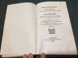 Solo gli ultimi 3 volumi. A fine del III. e IV. volume catalogo delle piante osservate dall'autore nel viaggio nella Nubia ed elenco dei sottoscrittori del giornaeìle. Il volume III è privo di legatura e presenta una macchia ai tagli. Difetti ai margini della legatura ai piatti dei volumi IV e V, v. foto. Una leggera gora d'acqua al margine inf. dx delle prime 70 pagine del volume V, ma nel complesso buoni. Pagg. 576; 287; 775. Mezza pelle. Mis mm 215X135
