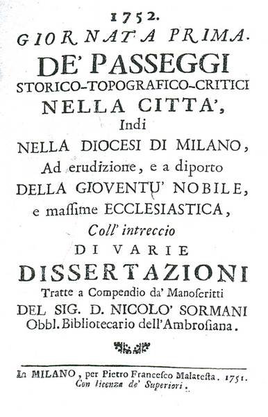 GIORNATA PRIMA (SECONDA TERZA) DE' PASSEGGI STORICO - TOPOGRAFICI - CRITICI NELLA CITTA' INDI NELLA DIOCESI DI MILANO. - Ad erudizione, e a diporto della gioventù nobile, e massime ecclesiastica. Coll'intreccio di varie dissertazioni, tratte a compendio da' manoscritti.