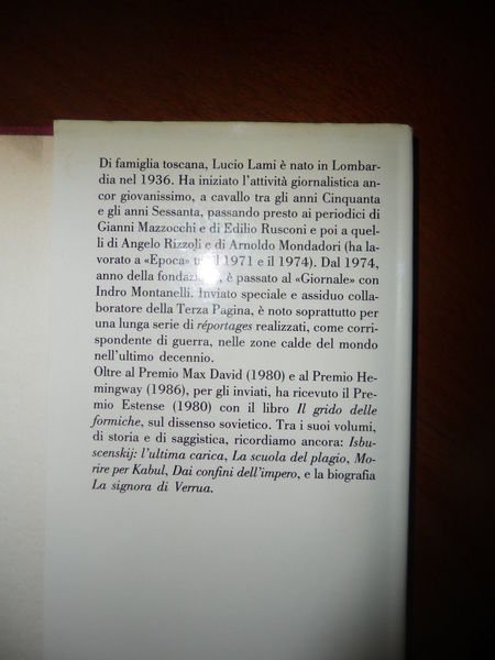 DESCRIZIONE: Mondadori Milano Collana Le Scie 1987 I^ Ed., br. ed. ca. con sovracc. ill. pp. 295 alcune ill. b/n f.t. in 8°. Lucio Lami è stato uno scrittore e giornalista italiano. Si avvicina al mondo del giornalismo negli anni Sessanta, diventando inviato per «La Notte», quotidiano pomeridiano diretto da Nino Nutrizio. Negli anni successivi diviene direttore di varie testate pubblicate prima da Rizzoli e poi da Arnoldo Mondadori Editore, diventando nel 1974 inviato speciale di guerra per il neonato «Il Giornale», collaborando nella redazione di Indro Montanelli. Collabora con i grandi editori dell’epoca, oltre ai già citati Rizzoli e Mondadori, anche Mazzocchi e Rusconi. Nel 1996 diventa direttore de «L'Indipendente». Ha vinto il Premio Max David nel 1980 e il Premio Hemingway nel 1986. Con il volume Il grido delle formiche ha vinto il Premio Estense nel 1981 e il Premio Sacharov nel 1986. Indice completo in foto. CONDIZIONI: Ottime, normali segni del tempo, ingiallimento al retro di cop. PESO / WEIGHT: 566 gr. without package