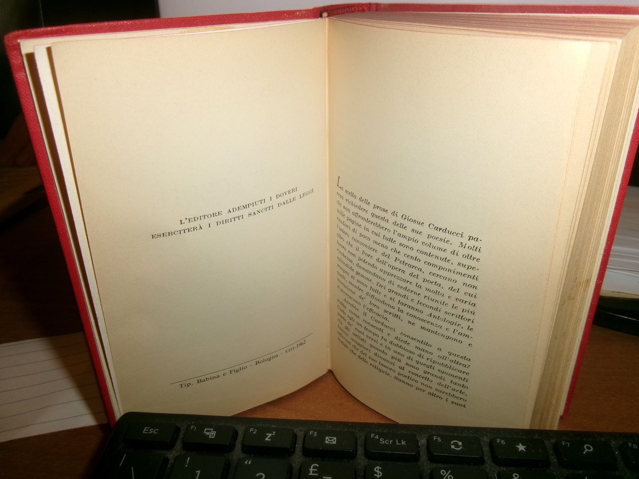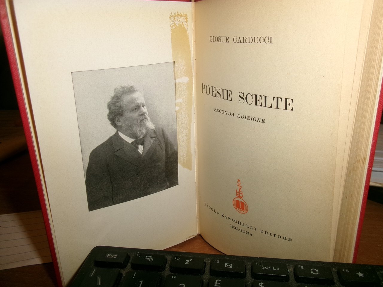 GIOSUE CARDUCCI. POESIE SCELTE - Bologna, Zanichelli, 1962. In-16° piccolo, tela edit. rossa con titolo e fregi in oro sul dorso. 409 pp. Ben conservato con scotch al verso del piano anteriore e vicino al ritratto di Carducci (meno evidente). Neg. scat. ultimi Hoepli.
