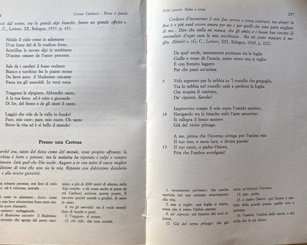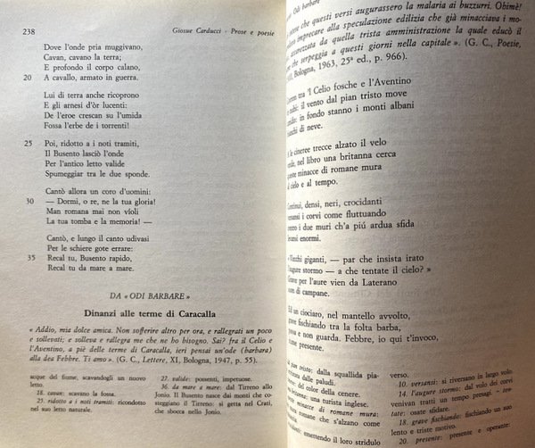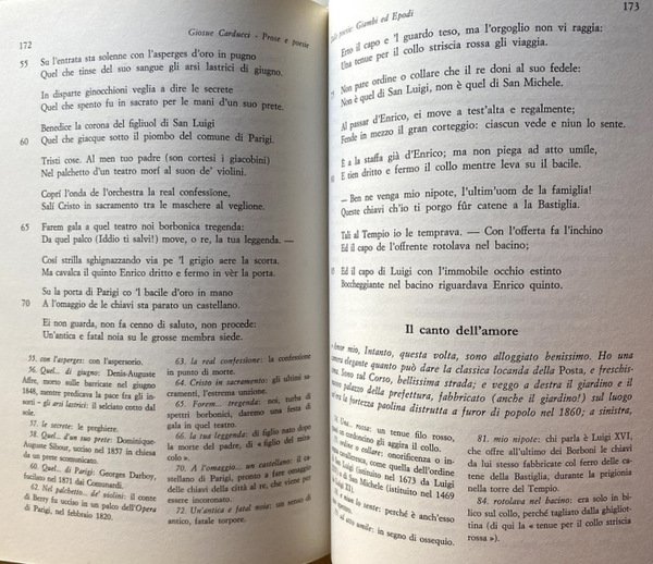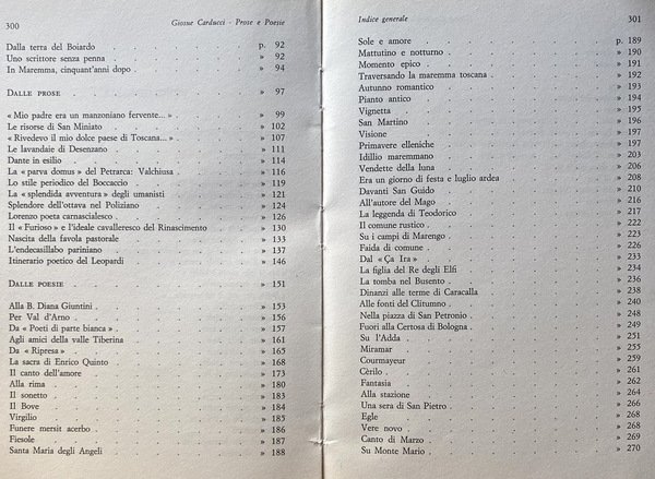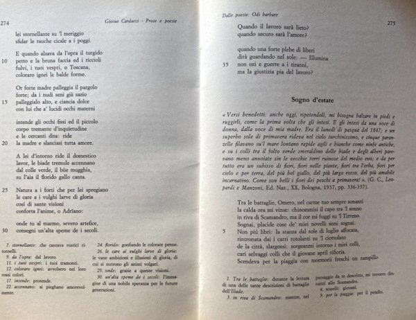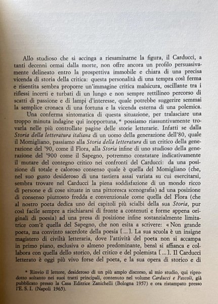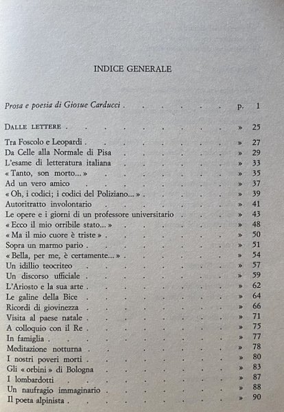 Soggetti: Letteratura italiana, Critica letteraria, Poesia, Prosa, Poesie, Antologie critiche, Raccolte poetiche, Antologia carducciana, Opera poetica, Opere generali, Momigliano, Francesco Flora, Ernesto Travi, Natalino Sapegno, Biografie, Interpretazione, Vita, Cultura classica, Storia letteraria, Filologia, Erudizione, Lidia, Thovez, Benedetto Croce, De Sanctis, Carolina Cristofori Piva, Lettere, Corrispondenza, Epistolario, Personalità, Donne, Foscolo, Leopardi, Petrarca, Boccaccio, Parini, Lirica, Poetica, Studi classici, Dante, Manzoni, Formazione, Anni giovanili, Toscana, Maremma, Monti, Paesaggio, Giudizio critico, Filosofia, Endecasillabi, Bellezza, Amore, Politica, Ideali, Fanciullezza, Morte, Sonetti, Rime, Canti, Ottocento, Patria, Garibaldi, Popolo, Rivoluzione, Grecia, Sentimento, Gloria, Guerra, Firenze, Francia, Premio Nobel, San Miniato, Poeta Nazionale, Roma, Angelo Sommaruga, Odi barbare, San Martino, Pianto antico, Davanti San Guido, Giovanni Pascoli, Severino Ferrari, Casa Carducci, Mario Rapisardi, Celle, Normale di Pisa, Letture, Ariosto, Poliziano, Bologna, Rinascimento, Ideale cavalleresco, Alpinismo, Nazionalismo, Patria, Romanticismo, Monarchia, Eroismo, Illuminismo, Risorgimento, Per la morte di Napoleone Eugenio, Miramar, Libertà, Positivismo, Scolopi, La chiesa di Polenta, Rime e Ritmi, Terme di Caracalla, Senatore, Odi barbare, Fanfulla della domenica, Latino, Omero, Pindaro, Teocrito, Virgilio, Orazio, Catullo, Distici elegiaci, Adda, Cattolicesimo, Il bove, Nicola Zanichelli, Laicismo, Istruzione, Università, Docenza, Juvenilia, Levia Gravi, Giambi ed Epodi, Libri Vintage Fuori catalogo, Bibliografia, Sinistra storica, Regno d'Italia, Poeti italiani del XX secolo, Conversazioni critiche, Canzone di Legnano, Il Parlamento, Italian literature, Literary criticism, Poetry, Prose, Poems, Critical anthologies, Poetic collections, Carducci's anthology, Poetic work, General works, Biographies, Interpretation, Life, Classical culture, Literary history, Philology, Erudition, Letters, Correspondence, Epistolary, Personality , Women, Lyric, Poetics, Classical studies, Education, Youth years, Tuscany, Maremma, Landscape, Critical judgment, Philosophy, Hendecasyllables, Beauty, Love, Politics, Ideals, Childhood, Death, Sonnets, Rhymes, Songs, Nineteenth century, Homeland, People, Revolution, Greece, Feeling, Glory, War, Florence, France, Nobel prize, National poet, Rome, Barbaric odes, Ancient crying, Readings, Renaissance, Knightly ideal, Mountaineering, Nationalism, Homeland, Romanticism, Monarchy, Heroism, Enlightenment, For the death of Napoleon, Freedom, Positivism, Rhymes and Rhythms, Baths of Caracalla, Senator, Barbarian Odes, Latin, Homer, Theocrit, Virgil, Horace, Catullus, elegiac couplets, Catholicism, Secularism, Education, University, Teaching, Out of print books, Bibliography, Historical left, Kingdom of Italy, Italian poets of the twentieth century, Critical conversations, The parliament