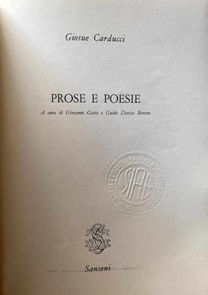 GIOSUÈ CARDUCCI: PROSE E POESIE. A CURA DI GIOVANNI GETTO E GUIDO DAVICO BONINO