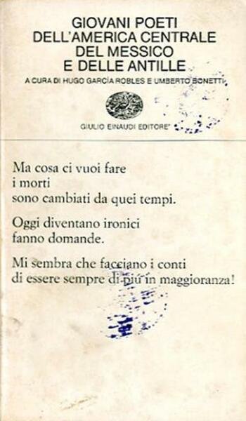 2. ed. X, 307 p. ; 18 x 11 cm. Collezione di poesia, 144. L'America Centrale (Costa Rica, El Salvador, Guatemala, Honduras, Nicaragua, Panama), il Messico e i paesi delle Antille di lingua spagnola (Cuba, Portorico, Repubblica Domenicana) costituiscono la cornice geografico-politica dell'antologia che viene proposta al lettore italiano, e che abbraccia quindi la parte dell'America Latina al nord del Sudamerica. A questa cornice geografica corrisponde un ambito culturale, storico e sociale che, pur nelle sue differenzazioni interne, permette di individuare certe caratteristiche comuni ai paesi trattati: discendenza culturale e linguistica spagnola, un passato precolombiano di alta cultura (Maya e Aztechi), presenza dominatrice del vicino nordamericano, economie in via di sviluppo. A cura di Hugo García Robles e Umberto Bonetti. Testo orig. a fronte. Brossura editoriale, coperta in cartoncino flessibile di colore bianco. Segni del tempo alla coperta e ai risvolti (ingiallimento e macchie), pagine interne pulite, per il resto libro integro. Codice libreria 6811.