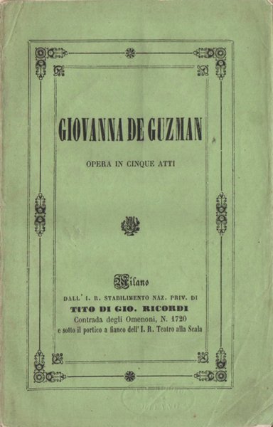 Libretto d’opera. Gran Teatro del Comune di Bologna, Autunno 1856. Elenco dei personaggi completo del nome degli interpreti tra cui Luigia Bendazzi, Raffaele Mirate, Guglielmo Giordani e Raffele Giorgi. La prima rappresentazione italiana si tenne a Parma al Teatro Regio il 26 Dicembre 1855 cambiando il titolo de “I Vespri Siciliani” in Giovanna de Guzman” a causa della censura.