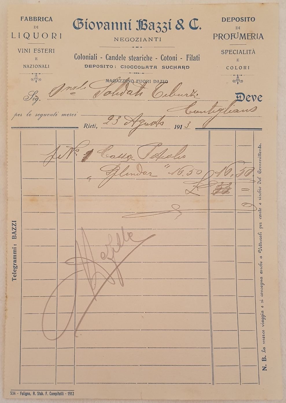 GIOVANNI BAZZI & C. NEGOZIANTI FABBRICA DI LIQUORI VINI ESTERI E NAZIONALI RIETI 23 AGOSTO 1913