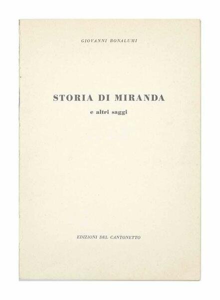 Autore: Giovanni Bonalumi Titolo: Storia di Miranda e altri saggi Edizione: Edizioni del Cantonetto 1963 Dimensioni: 18x12,5 cm Pagine: 200 Copertina: Cartonato Condizioni: Ottime come da foto
