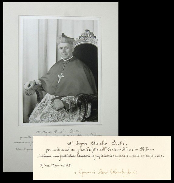 fotografia originale con dedica e firma del Cardinale Giovanni Colombo su cartoncino formato 27,5X39 cm circa datata Milano, 23 gennaio 1967; ottimo es.