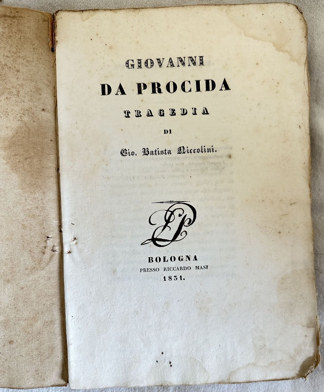 Rara prima edizione del 1831 di questa celebre tragedia di Giovanni Battista Niccolini (San Giuliano Terme 1782- 1861). Niccolini in politica fu liberale, repubblicano, anticlericale e contrastò l'ideologia neoguelfa. L'opera venne rappresentata per la prima volta nel 1830 e ne venne proibita la replica fino al 1847 perchè non in linea con la costituzione del Regno d'Italia. In buone condizioni. Copertina morbida coeva con titolo manoscritto su etichetta al dorso in buone condizioni con lievi usure marginali. Legatura in buone condizioni. Pagine in buone condizioni con rare fioriture. In 8. Dim. 23,5x16. Pp. 113+(1).Scarce first edition of 1831 of this collection of poems by Giovanni Battista Niccolini (San Giuliano Terme 1782- 1861). the work was represented for the first time in 1830 and its reply was forbidden until 1847 because contrary to the constitution of italia Reign. In good conditions. Soft coeval cover with handwritten title in the spine in good conditions lightl worn in the extremities. Binding in good conditions. Pages in good conditions with occasional foxing. In 8. Dim. 23,5x16. Pp. 113+(1).<BR><BR>