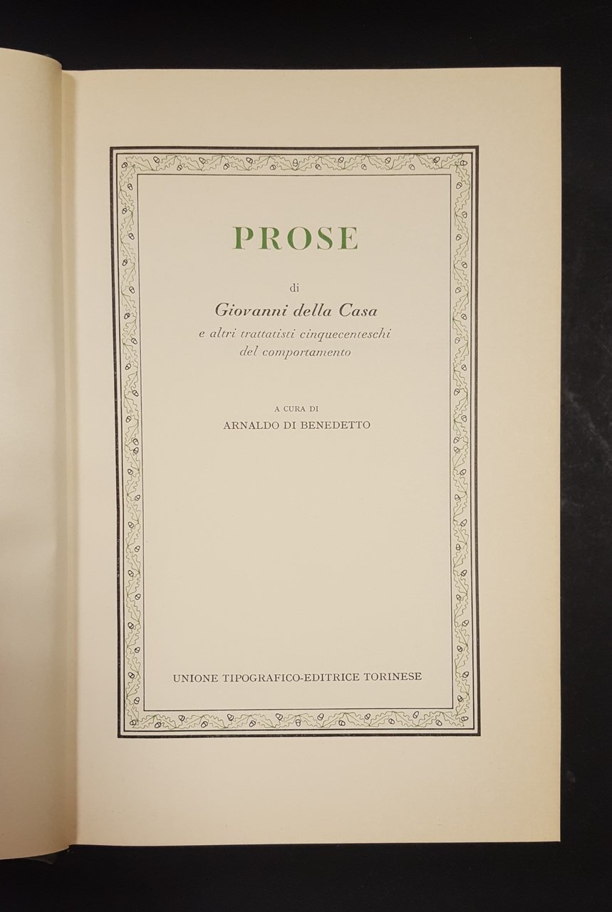 Prose di Giovanni della Casa e altri trattatisti cinquecenteschi del comportamento. Utet. 1974. In-8. Cartonato con titoli e fregi in oro al dorso. pp. 757. Con acetato protettivo. Con tavv. in b/n f.t. Ottimo