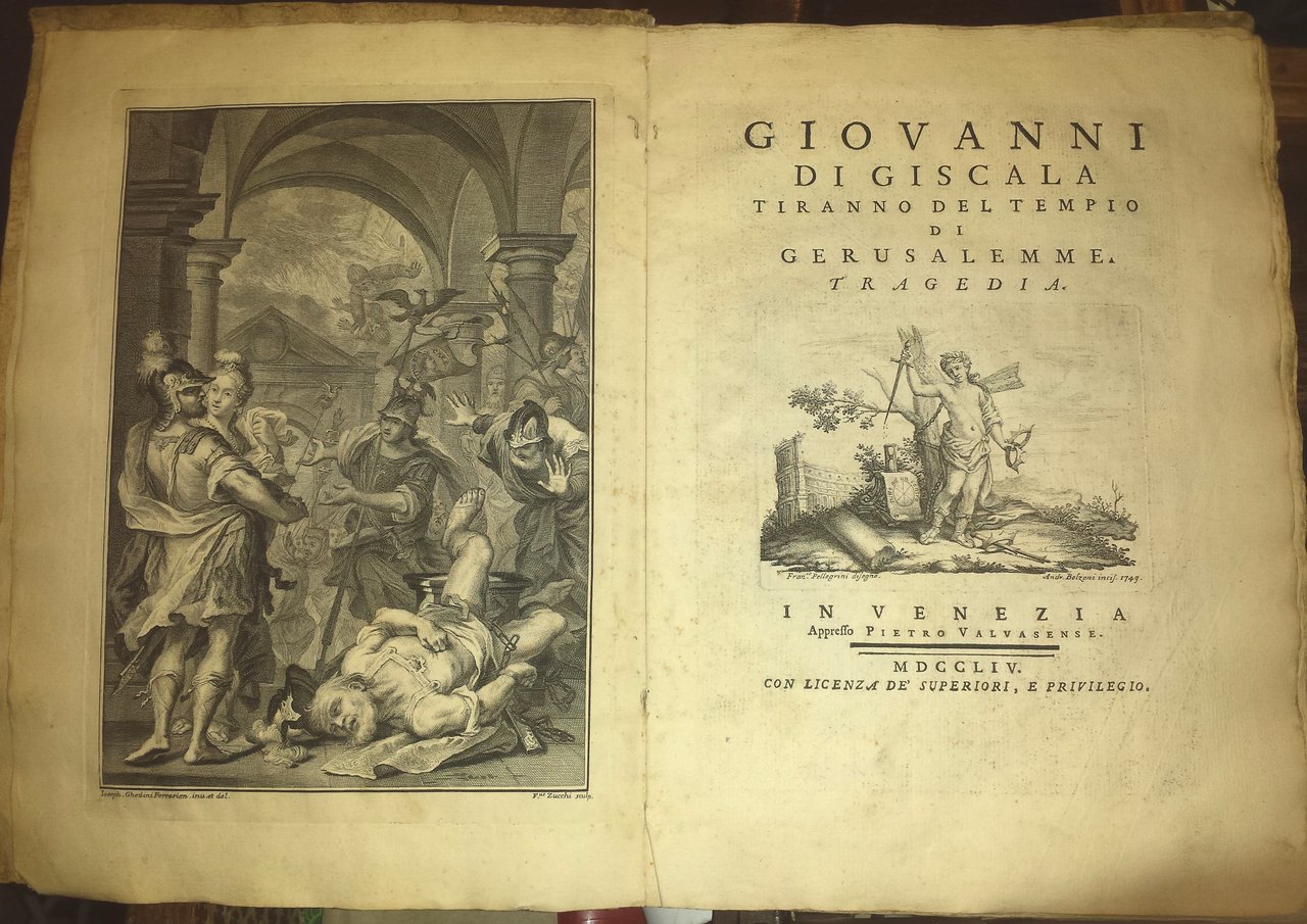 In-4 (28,5 cm) (1) c. (antiporta) LII CXXIV. Sul frontespizio vignetta calcografica con le sottoscrizioni: Franco Pellegrini disegno, Andr. Bolzoni incis. 1749. Numerose testatine, iniziali e finalini calcografici nel testo: alcuni sottoscritti da Ghedini. All'occhietto il titolo: Giovanni di Giscala Tragedia. Cartoncino rustico. Antiporta calcografica con le sottoscrizioni: Ioseph. Ghedini Ferrarien. inv. et del., F.us Zucchi sculp. Nome dell'Autore dalla dedica. Dorso con mancanze in prossimità dei due nervi, e foro da tarlo che parte dal piatto posteriore fino all'ultima pagina del testo; alone di gora alla legatura.Varano Alfonso (Ferrara 1705 - ivi 1788): poeta appartenente alla famiglia ducale. Ricco, non ambizioso, visse una vita semplice e solitaria dedita agli studî e alla pietà. Dopo giovanili rime amorose, bernesche, pastorali, d'occasione e di devozione, scrisse due tragedie classicheggianti, Demetrio (1749) e Giovanni di Giscala (1754); in quest'ultima il protagonista è rappresentato in una sua furente magnanimità che fa sentire vicino il Romanticismo. Per la loro lugubre tristezza lo preannunciano anche le 12 Visioni sacre e morali, l'opera più nota di V., cominciate nel 1749, terminate nel 1766, ma poi corrette per tutto il resto della vita. A esse seguirono ancora le tragedie Agnese e Saeba regina di Ginge e di Taniorre.