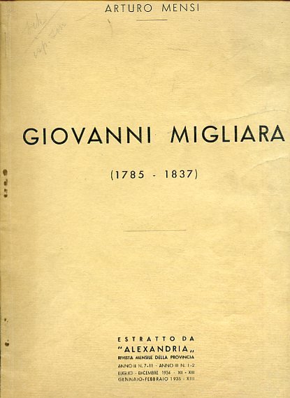 Giovanni Migliara (1785 - 1837). Estratto da 'Alexandria' Rivista mensile della Provincia. Anno II n. 7 - 11. Anno III N. 1 - 2. Luglio - Dicembre 1934. Gennaio - Febbraio 1935