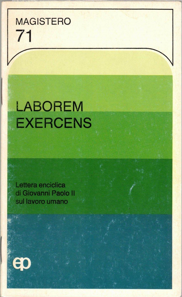 Laborem exercens. Lettera enciclica del sommo Pontefice Giovanni Paolo II sul lavoro umano. Nel 90° anniversario dell’Enciclica Rerum Novarum. Ep (Figlie di S. Paolo), Roma 1981, pp. 63, cm 18, pubblicazione rilegata a punto metallico. Collana Magistero, vol. 71. Lievi tracce d’uso alla copertina, leggera brunitura della carta, per il resto ben conservato.
