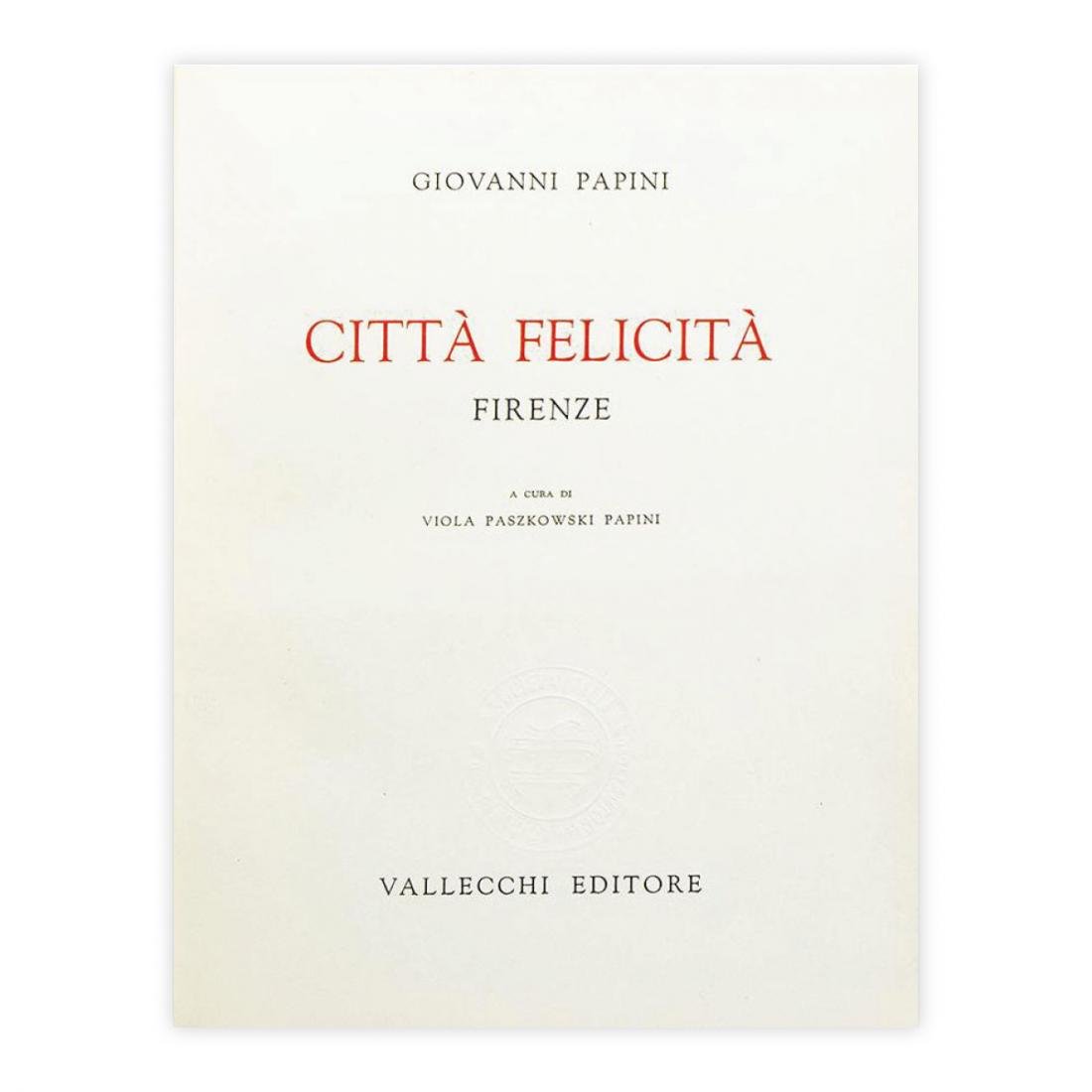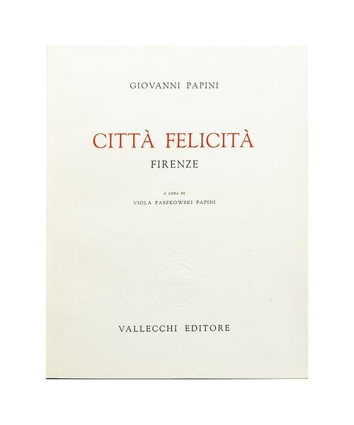 Autore: Giovanni Papini Titolo: Città Felicità Sottotitolo: Firenze - a cura di Viola Paszkowski Papini Edizione: Vallecchi Editore 1960 Dimensioni: 17,5 x 21,5 cm c.a. Pagine: 207 Copertina: Cartonato Condizioni: Ottime come da foto