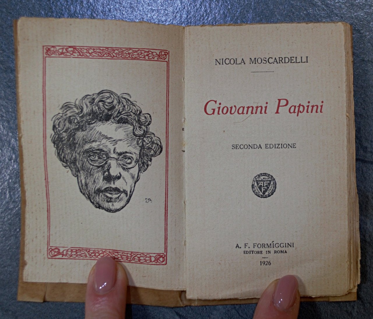 Ritratto di Papini in antiporta. Formiggini - Roma, II edizione 1926. Pergamena editoriale con fregi in nero alla copertina e titoli al piatto e al dorso.6,5x11; pp.64. OTTIMO STATO , Ottimo (Fine)