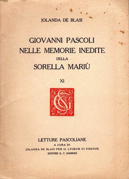 Giovanni Pascoli nelle memorie inedite della sorella Mari√π, prima edizione 1937, pp. 25, formato 16,5 x 23.<BR>Copertina morbida con alette di colore beige, con titoli in nero al piatto anteriore.Volumetto stampato in 200 copie. Nostra copia n. 94.In prima pagina presente bella dedica dell'autrice.<BR>Piccole macchie al piatto anteriore. Nel complesso ottime condizioni.