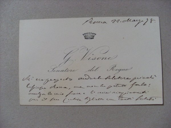 biglietto da visita del Senatore Giovanni Visone datato Roma, 22 marzo 1878; ottimo es.