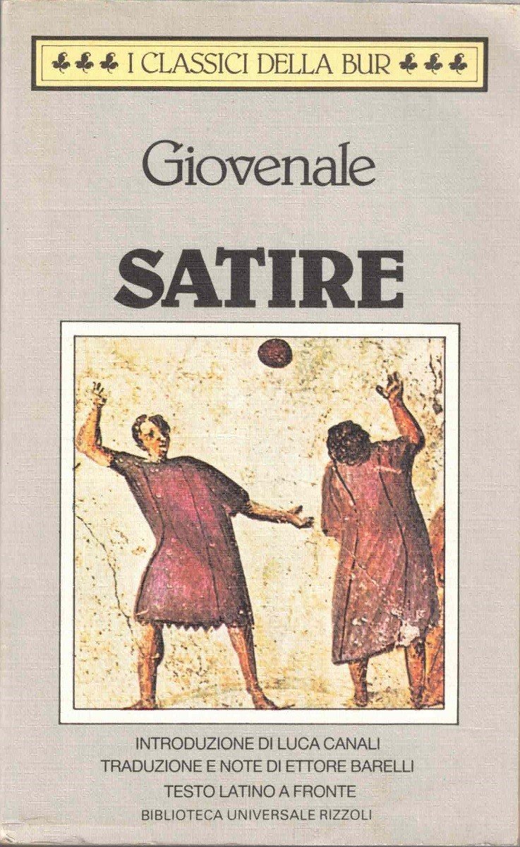 Decimo Giunio Giovenale (Decimus Iunius Iuvenalis), Satire, introduzione di Luca Canali, premessa al testo, traduzione e note di Ettore Barelli, testo latino a fronte, RCS Rizzoli Libri S.p.A., Milano 1992, quinta ed., pp. 421, ill. b.n., cm 18, br. ed. Collana Biblioteca Universale Rizzoli. I classici della Bur, vol. L52. Titolo dell’opera originale: Saturae. Testo latino a fronte con traduzione, introduzione, note e apparati in lingua italiana. iccola firma d’appartenenza al frontespizio. Minime tracce d’uso, leggero alone bruno al taglio esterno, uniforme brunitura della carta, per il resto molto ben conservato.