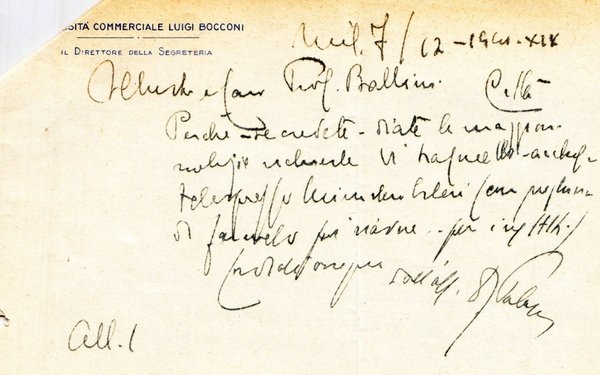 2 comunicazioni con relativa risposta manoscritta e firmata di Girolamo Palazzina su carta intestata "Università Commerciale Luigi Bocconi. Il Direttore della Segreteria" di 1 facciata datata 7 Dicembre 1941; buoni es.