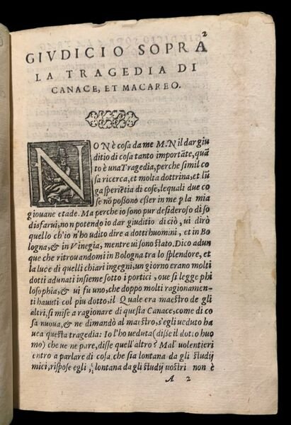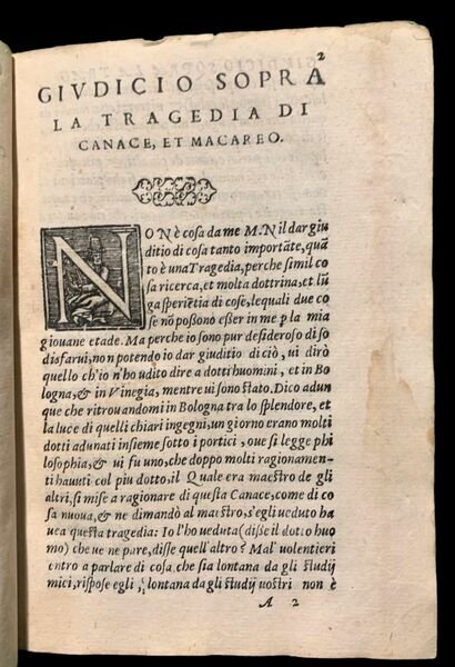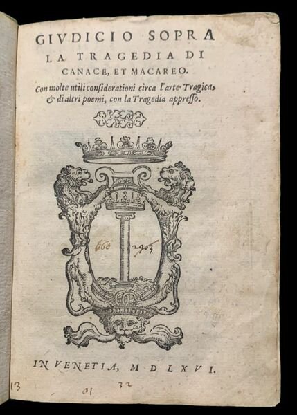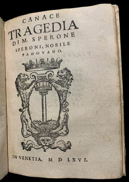 Giudicio sopra la Tragedia di Canace, et Macareo. Con molte utili considerationi circa larte Tragica, et di altri poemi, con la Tragedia appresso. Unito a: Canace Tragedia di M. Sperone Speroni, Nobile Padovano.