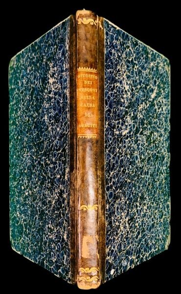 20,8x13,5 cm; 144 pp. Bella legatura coeva in mezza pelle con titolo impresso in oro entro cornice su tassello chiaro. Piatti foderati con carta marmorizzata azzurra. Piccolo forellino di tarlo al margine interno bianco delle prime tre carte e per il resto in magnifiche condizioni di conservazione dalla carta pulita e fresca. Interessante raccolta di testimonianze che si ricollegano alla disputa della soppressione dell'ordine dei gesuiti. Molte sotto forma di lettere di vari eminenti personaggi. Le testimonianze riguardano principalmente lo Stato pontificio, il Regno delle Due Sicilie, il Ducato di Modena, quello di Parma e il Regno Lombardo-Veneto. Bella copia arricchita dalla bella legatura. Bell'esemplare.