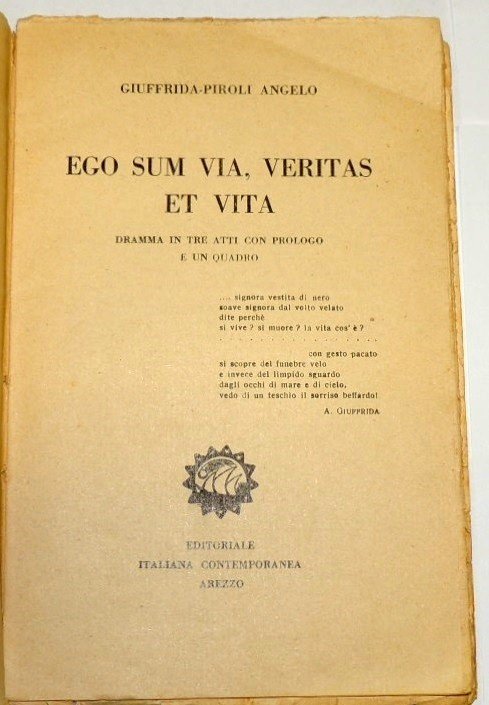Angelo Giuffrida Piroli, Ego sum via, veritas et vita. Dramma in tre atti con prologo e un quadro, Editoriale Italiana Contemporanea, Arezzo, s.d. (1927?), pp. 31, cm 20, br. ed. Pubblicazione molto rara. Lunga dedica autografa dell'autore alla copertina anteriore, tracce d'uso alla brossura.