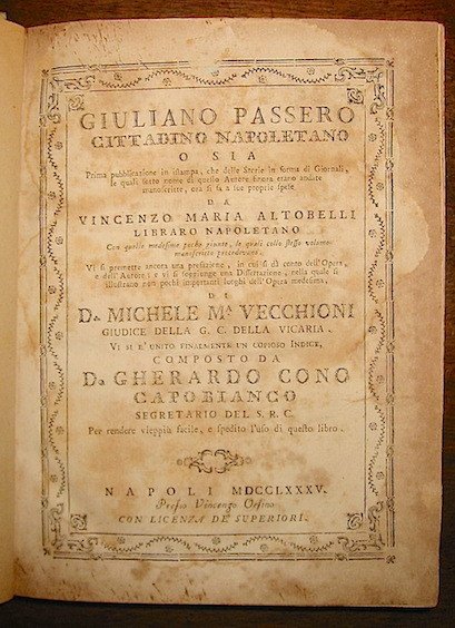 Giuliano Passero cittadino napoletano o sia prima pubblicazione in istampa, che delle Storie in forma di Giornali, le quali sotto nome di questo autore finora erano andate manoscritte, ora si fa a sue proprie spese da Vincenzo Maria Altobelli. Vi si premette ancora una prefazione. e vi si aggiunge una Dissertazione. di d. Michele Maria Vecchioni. Vi si è unito finalmente un copioso Indice composto da Gherardo Cono Capobianco.