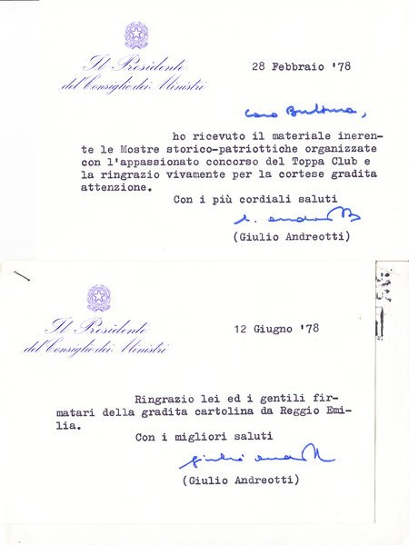 2 biglietti autografi di Giulio Andreotti al Rag. Ernesto Buttura, Presidente del Toppa Club completi di busta; i biglietti hanno intestazione "Il Presidente del Consiglio dei Ministri" e sono del 28 febbraio 1978 e 12 giugno 1978; ottimi ess.